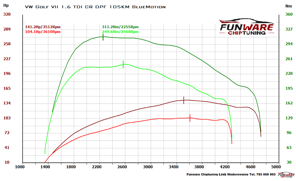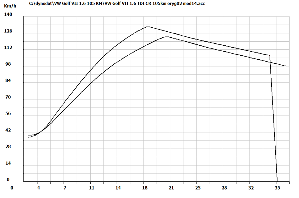 Najnowszy model VW Golfa to bardzo zgrabne auto o którym marzy wielu z nas:) Jest to idealny przykład auta który sprawdzi się zarówno na średnich trasach jak i w mieście. Silnik 1.6 TDI CR BlueMotion charakteryzuje sie niezwykle niskim spalaniem i dużym zapasem mocy u producenta. Egzemplarz w którym mieliśmy okazje przeprowadzać modyfikacje wszystkie parametry pracy miał książkowe. Wiec długo nie zastanawiając się przystępiliśmy do modyfikacji. Po długiej walce o każdego Niuta ostatecznie udało nam się uzyskać aż +61 Nm i 37KM więcej od oryginału. Różnica w przyspieszeniu jest b. dużo co widać na wykresie elastyczności na 3 biegu. Obecnie auto przyspiesza aż o 4,5 sek szybciej!