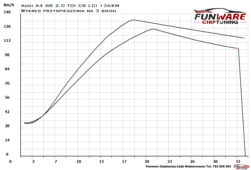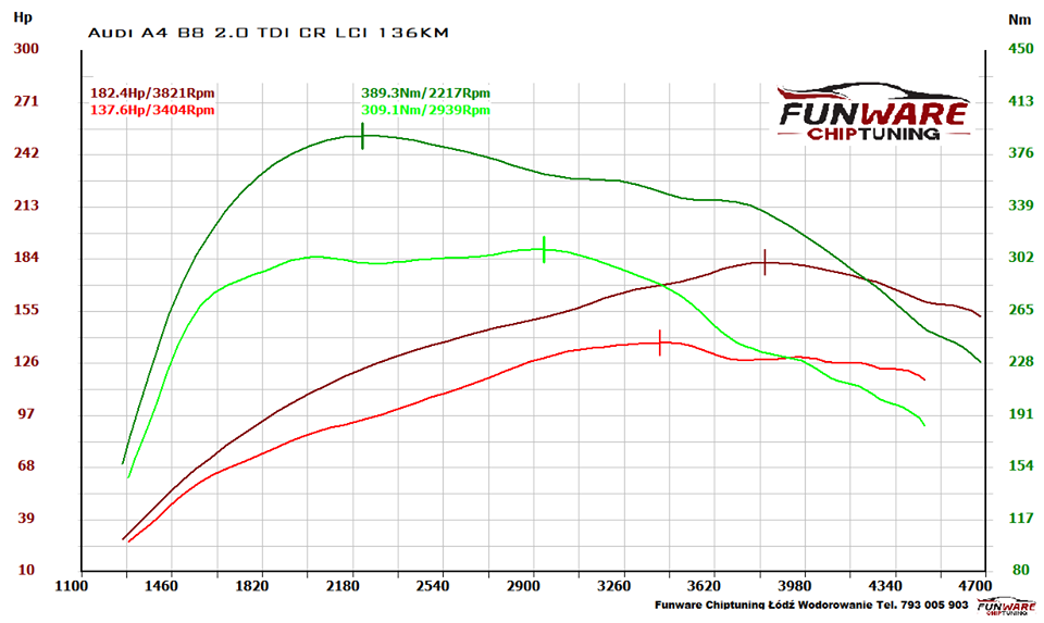 My mieliśmy doczynienia z poliftingową Audi A4 B8 2.0TDI o mocy 100kW czyli 136KM która na modyfikacje przyjachała do nas prosto z Turku. Jest to jedna ze słabszych wersji silnika i jednak 136KM w rodzinnym kombi klasy premium to troche za mało. Auto przed modyfikacją zostało podane zabiegowi wodorowania silnika, po sprawdzeniu stanu podzespołów i wodorowaniu nasza hamownia pokazała 139KM i 309Nm. Sam chiptuning nie sprawił większych problemów, jeden program plus poprawka aby dostroić auto i mieliśmy zadowalający nas wynik: 182KM i 389Nm. Nie da się nie odczuć dodatkowych 43KM i 80Nm. Gdyż elastyczność na 4 biegu poprawiła się aż o 4 sec!