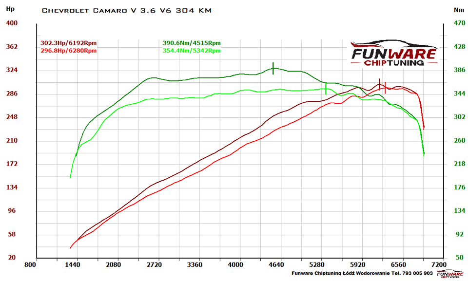 Auto przed chipem pokazało na naszej hamowni 297KM i 354 Nm. Po naszych modyfikacja uzyskaliśmy końcowo 302Km i 390Nm na paliwie PB95.