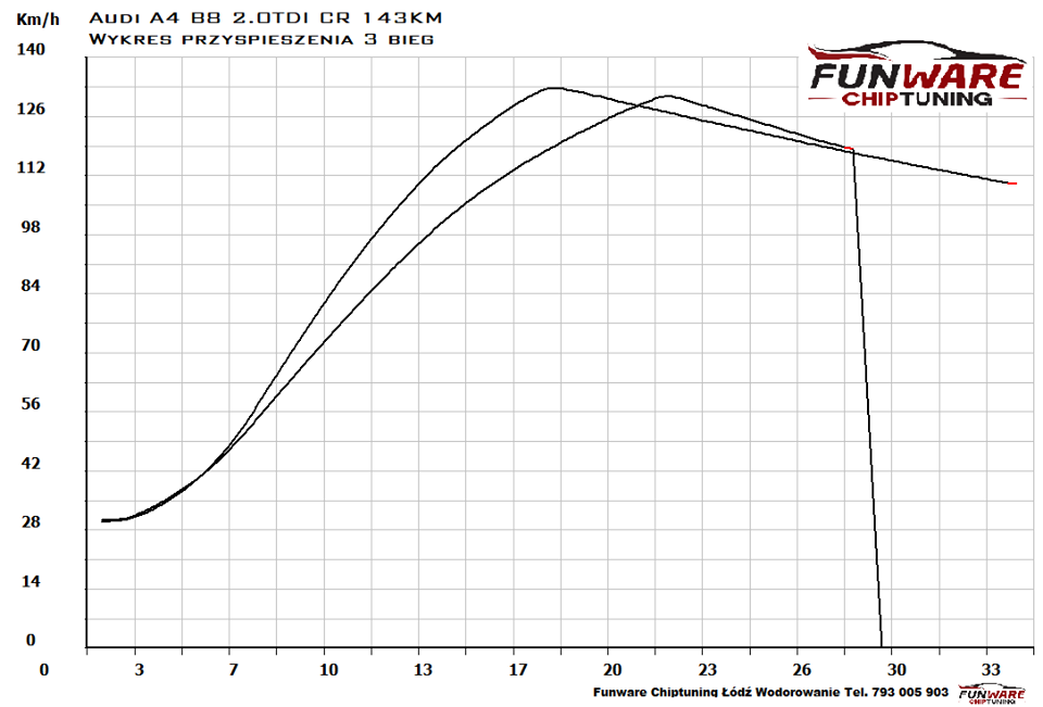 Auto uzyskało dodatkowe 85Nm i 40KMktóre teraz wciskają w fotel wciskając pedał gazu powyżej 2 tys obrotów. Wykres przyspieszenia na 3 biegu mówi sam za siebie sprint do końca obrotów jest obecnie o 4,5 sekundy szybszy niż poprzednio.