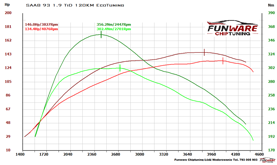 Przystępując do ekotuningu liczyliśmy na około 320-330Nm ale tutaj również otrzymaliśmy rewelacyjny wynik 375Nm który obniżyliśmy z obawy o sprzęgło do 356Nm. Jesteśmy pewni, że w wypadku zwykłego chip tuningu dobilibyśmy do 400Nm a to jest już wynik osiagany przez silniki 1.9 tid 150KM.