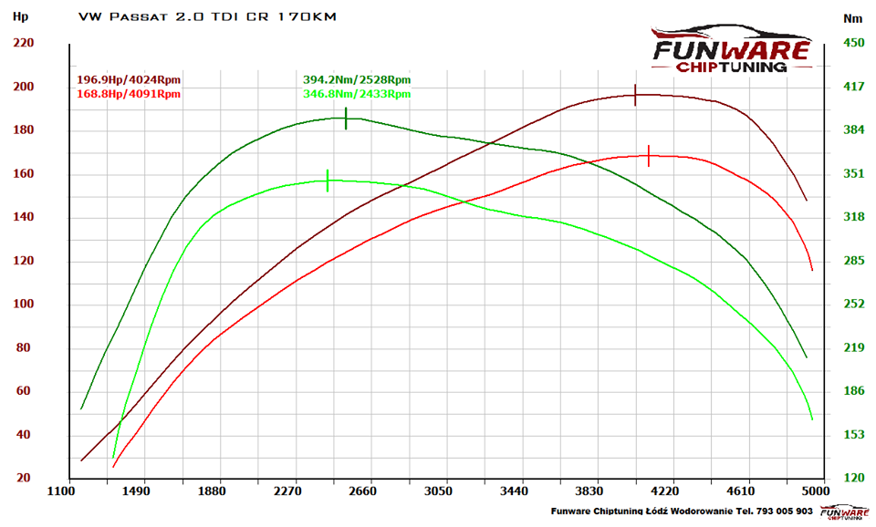 Egzemplarz który do nas przyjechał na naszej hamowni uzyskał wynik niemalże seryjny a różnice 1KM i 3Nm można uznać za błąd pomiarowy;) Przed zabiegiem chip tuningu aby oczyścić silnik z nagaru przeprowadziliśmy również wodorowanie silnika. W planach mieliśmy osiagnąć 200KM i 400Nm co było w zasięgu tego modelu ale jednak zdecydowaliśmy się nie walczyć o cyferki a pozostać na bezpiecznym poziomie, ostatecznie skończyło się na 197KM, 394Nm i kolejnym zadowolonym kliencie:D