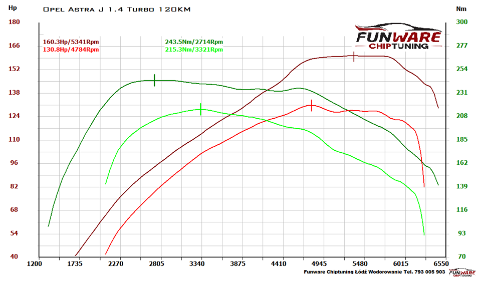 Silnik 1.4 Turbo niezależnie od wersji sterowany jest przez Sterownik Delco e78 który niejednemu tunerowi dał się w kość. My też potrzebowaliśmy nieco czasu tym bardziej, że auto było po aktualizacji która zupełnie zmieniała strukturę pliku, typową dla tego sterownika. Auto jak to bywa w 90% aut benzynowych które do nas przyjeżdżają miało już liche świece. Przez które strojenie nie dawało zadanych efektów. Auto w serii na starych świecach miało 127KM i 207Nm. Ale chip tuning dawał jedynie 135KM i 230Nm, które dodatkowo miało bardzo nieciekawy przebieg krzywych (fale dunaju). Po wymianie świec (koszt 200zł z wymianą) i wgraniu moda auto odżyło jak nowe i pokazało 30 KM i 30 Nm wiecej;)